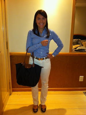 Explicação: Lá na empresa não é obrigatório usar um traje “formal”, como calça social, etc. Mas como a gente tem sempre reuniões e visitas inesperadas, é sempre bom estar arrumadinha para o que der e vier. Por isso eu sugiro a camisa social e sapatilhas, afinal, a gente nunca sabe se vai precisar andar muito no dia – total caixinha de surpresas! hahaha