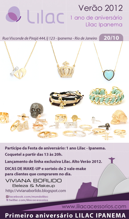 Estão achando que o post termina aqui? nada disso! Para comemorar o 1 ano da Lilac em Ipanema, acontece nessa quinta (20/10) um coquetel das 13h à 20h, onde será apresentada a nova coleção de alto-verão da marca. Para completar o evento, dicas de maquiagem com Viviana Borlido e sorteio de 2 vale-makes. Comprinhas, champs, e beauté, tudo que nós mulheres amamos.