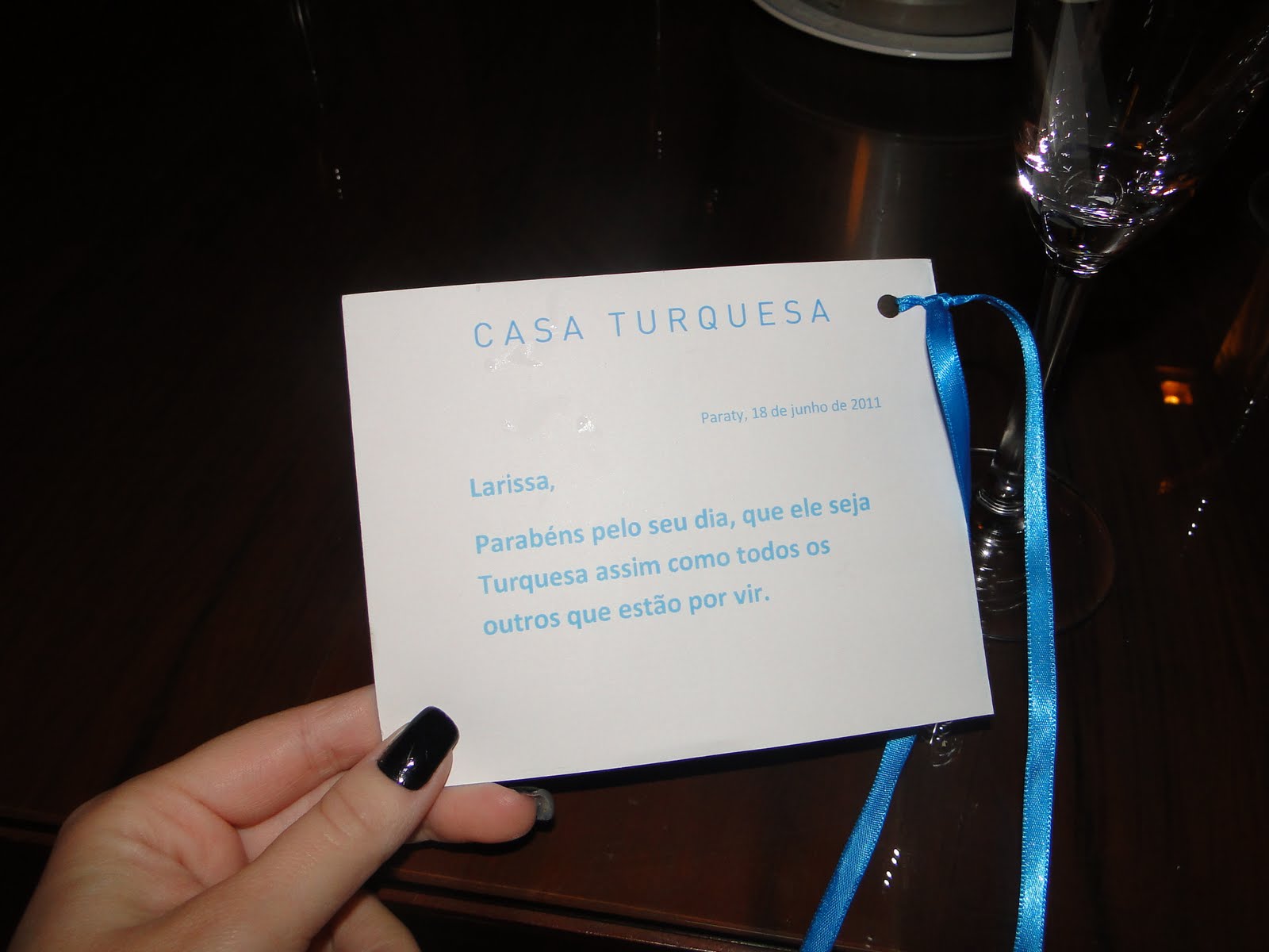 Na primeira noite, eles colocaram no quarto kits com produtos da Granado, diferentes para homem e mulher. Na segunda noite, chocolate, toalhinha, cordão e cachaça artesanal para cada um. E como meu pai avisou que era meu aniversário, eu ganhei uma Chandon, cartão personalizado, e dois mini-bolos. Fofis!