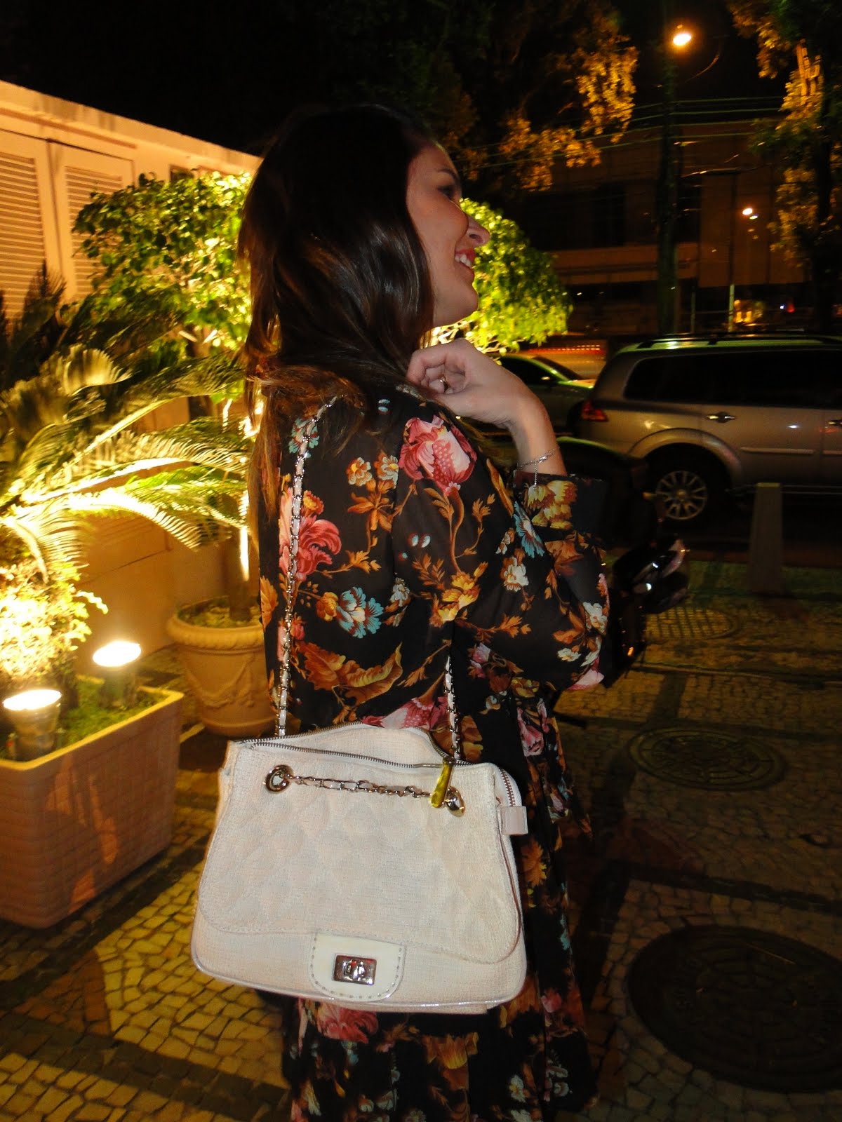 Detalhe da bolsa e da estampa mara do vestido