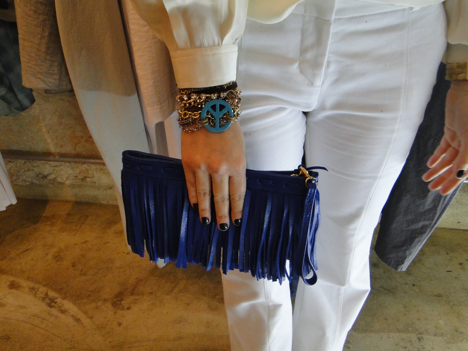 Zoom na minha pulseira da Kolut (já contei nesse post aqui) e na minha nova clutch da AMIE. Estou in love total!!!! Além de ser toda de franjas (tendência que eu contei nesse post aqui), tem essa cor azul klein poderosa para combinar com branco.