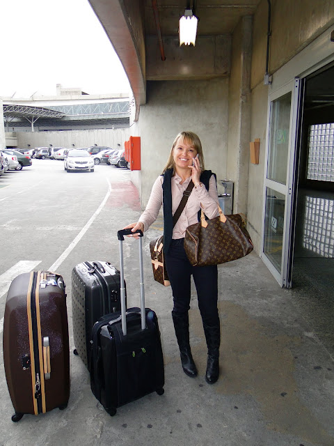 Créditos: calça Le Lis Blanc (igual a minha)/ camisa Pathisa/ botas Arezzo/ casaco de tricô Agilità/ bolsas Louis Vuitton/ malas Sansonite