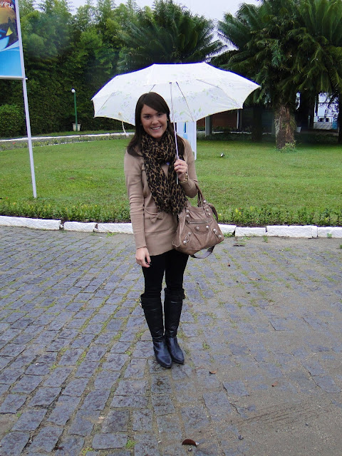Quando o tempo está chuvoso, eu não penso duas vezes, e coloco minhas botas de montaria para jogo. Podem falar que é demodé, está out, etc, mas eu não me importo. Amo a praticidade que elas dão, e o fato de não deixarem meus pésinhosmolhados (fresca!). Como diria a música de Jorge Benjor, look para um dia de “chove chuva, chove sem parar…”
