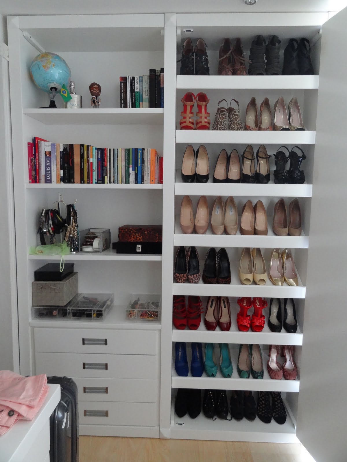 Como o meu closet fica na área de serviço (adaptamos um cômodo que era onde guardavamos malas, coisas variadas, etc), eu decidi fazer uma sapateira atrás do espelho para guardar os sapatos que eu mais uso normalmente. Assim, economiza tempo – and time is money!